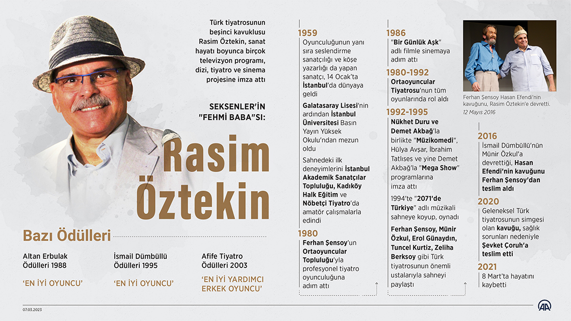 Sahnelerin güldüren yüzü Rasim Öztekin, oyunculuğun yanı sıra dizi ve filmlerde yaptığı seslendirmeler ve imza attığı köşe yazılarıyla gönüllerde yer edindi. (Grafik: Kemal Delikmen/AA)