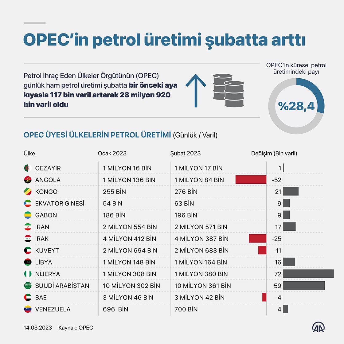 Petrol İhraç Eden Ülkeler Örgütünün (OPEC) günlük ham petrol üretimi şubatta bir önceki aya kıyasla 117 bin varil artarak 28 milyon 920 bin varil oldu.