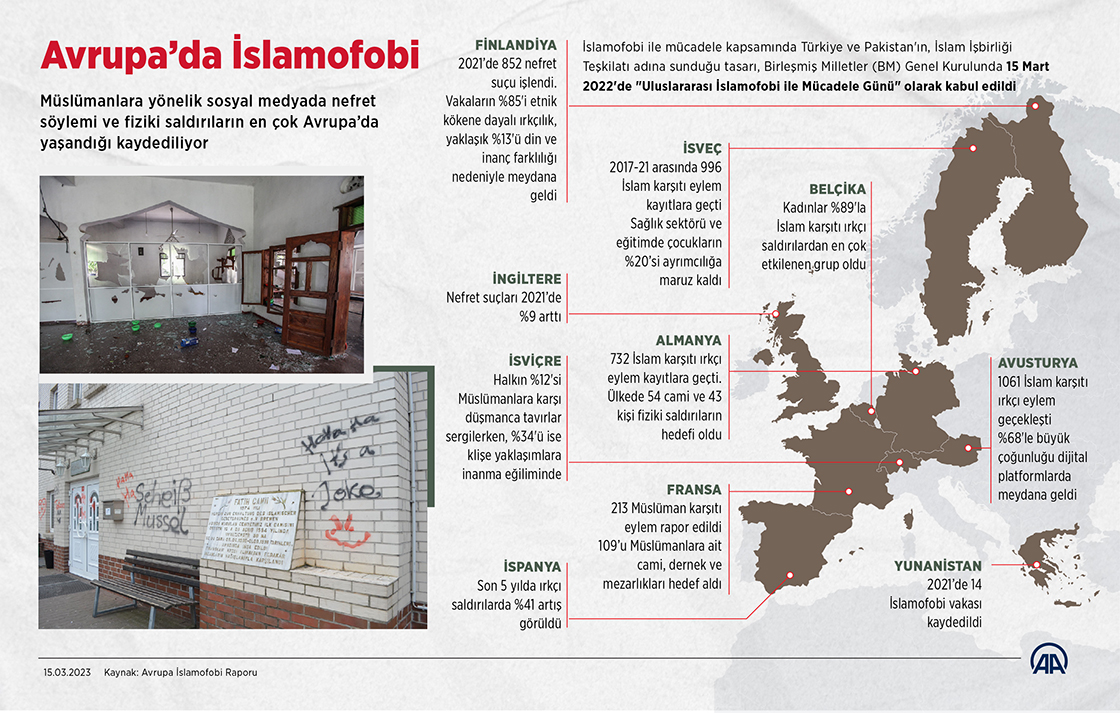 Müslüman toplumlara karşı işlenen nefret suçu, başta Avrupa ülkeleri olmak üzere dünya genelinde terör olaylarına dönüşüyor. (Grafik: Muhammed Ali Yiğit/AA)