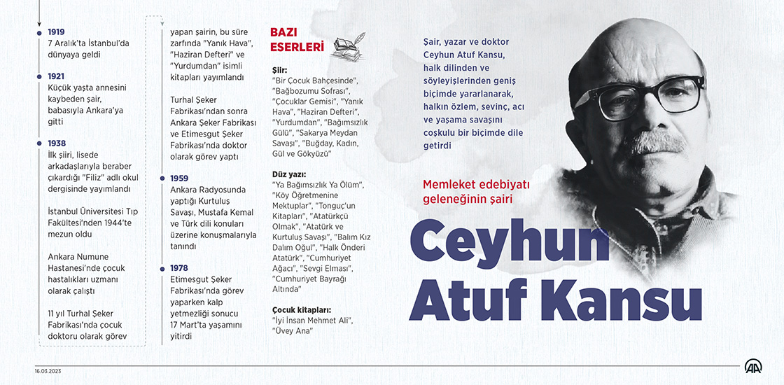 Cumhuriyetin ilk yıllarında ortaya çıkan memleket edebiyatı geleneğinin ilk temsilcilerinden Ceyhun Atuf Kansu'nun vefatının üzerinden 45 sene geçti. (Grafik: Kemal Delikmen/AA)