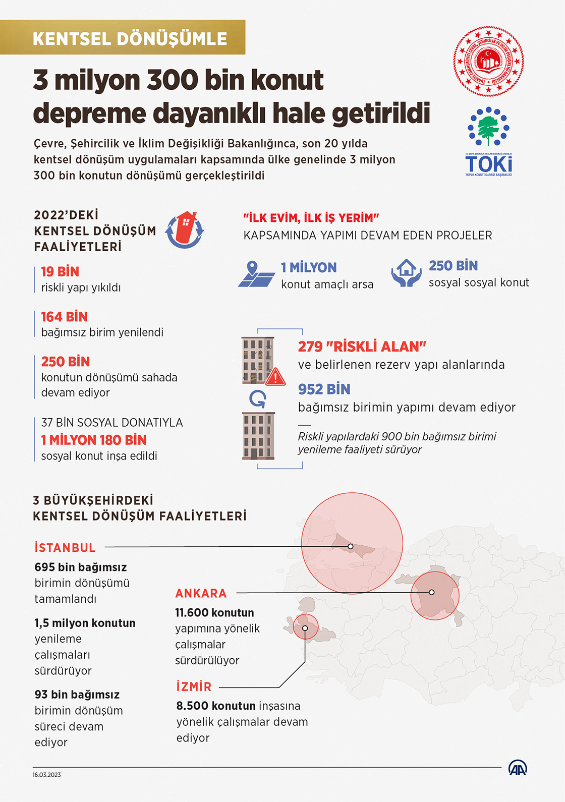 Çevre, Şehircilik ve İklim Değişikliği Bakanlığınca, son 20 yılda kentsel dönüşüm uygulamaları kapsamında ülke genelinde 3 milyon 300 bin konutun dönüşümü gerçekleştirildi. (Grafik: Muhammed Ali Yiğit/AA)