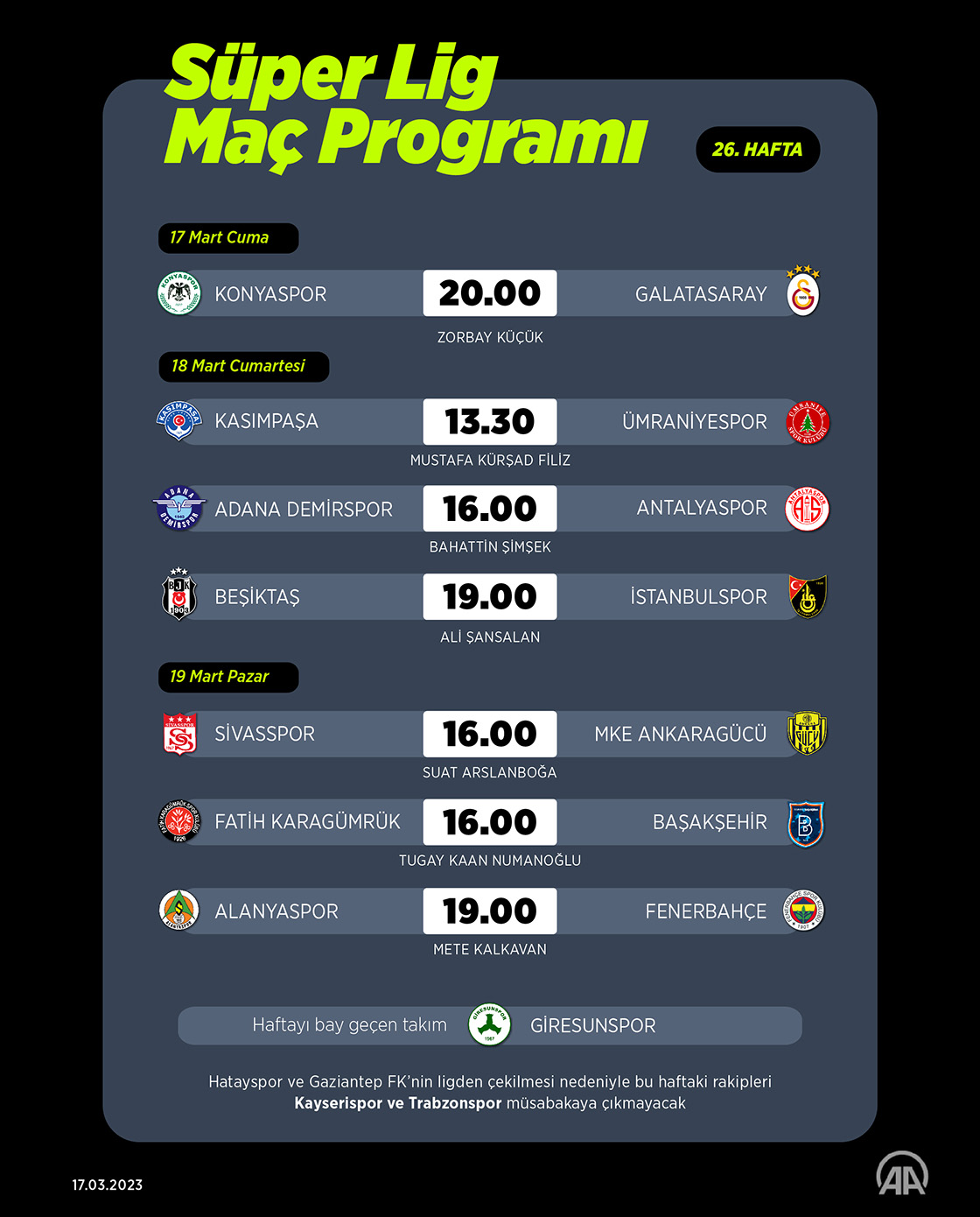 Süper Lig'de 26. hafta mücadelesi 17 Mart Cuma günü oynanacak tek maçla başlayacak. (Grafik: Kemal Delikmen/AA)
