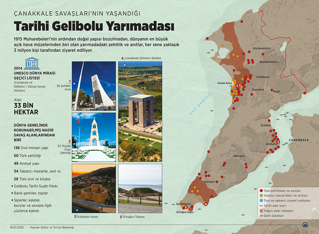 1915 Muharebeleri'nin ardından doğal yapısı bozulmadan dünyanın en büyük açık hava müzelerinden biri olan yarımadadaki şehitlik ve anıtlar, her sene yaklaşık 3 milyon kişi tarafından ziyaret ediliyor. (Grafik: Muhammed Ali Yiğit/AA)