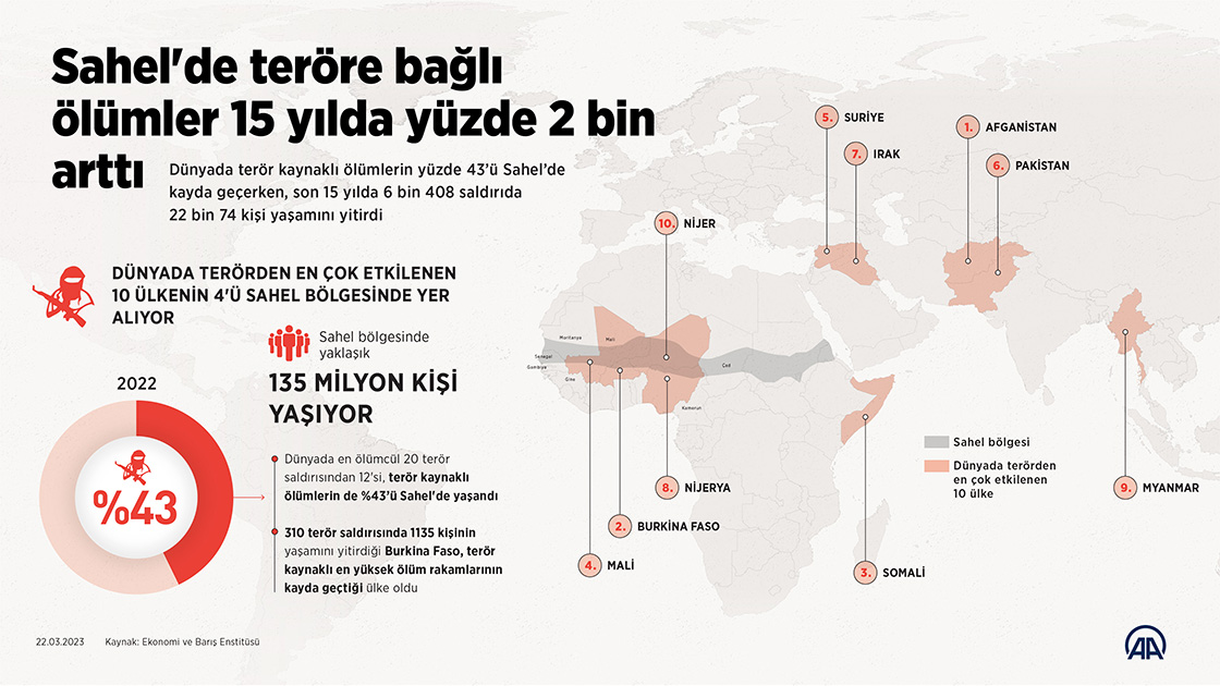 Sahra Altı Afrika'da yer alan Sahel bölgesinde terör saldırıları sonucu kayda geçen ölümler, son 15 yılda yüzde 2 bin artış gösterdi ve 6 bin 408 saldırıda 22 bin 74 kişi yaşamını yitirdi. (Grafik: Muhammed Ali Yiğit/AA)