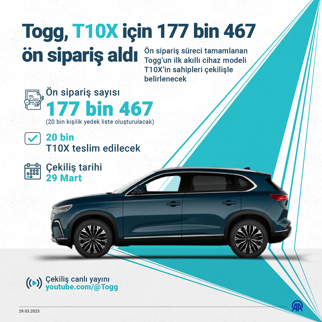 Ön sipariş süreci tamamlanan Togg’un ilk akıllı cihaz modeli T10X’in sahiplerinin belirleneceği çekiliş canlı yayımlanacak. (Grafik: Omar Zaghloul/AA)