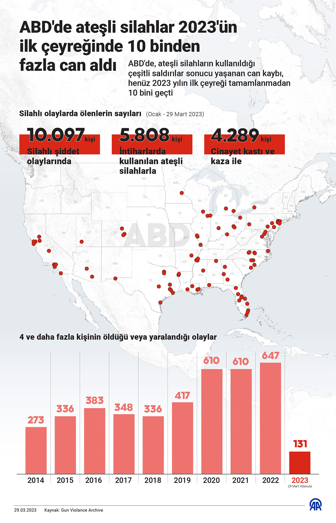 ABD'de, ateşli silahların kullanıldığı çeşitli saldırılar sonucu yaşanan can kaybı, henüz 2023 yılın ilk çeyreği tamamlanmadan 10 bini geçti. (Grafik: Yasin Demirci/AA)