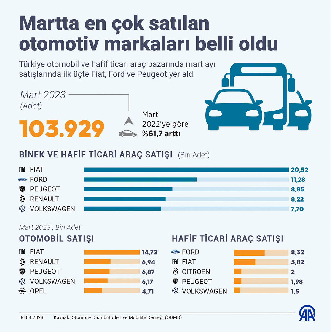 Türkiye otomobil ve hafif ticari araç pazarında mart ayı satışlarında ilk üçte Fiat, Ford ve Peugeot yer aldı. (Grafik: Mahmut Resul Karaca/AA)