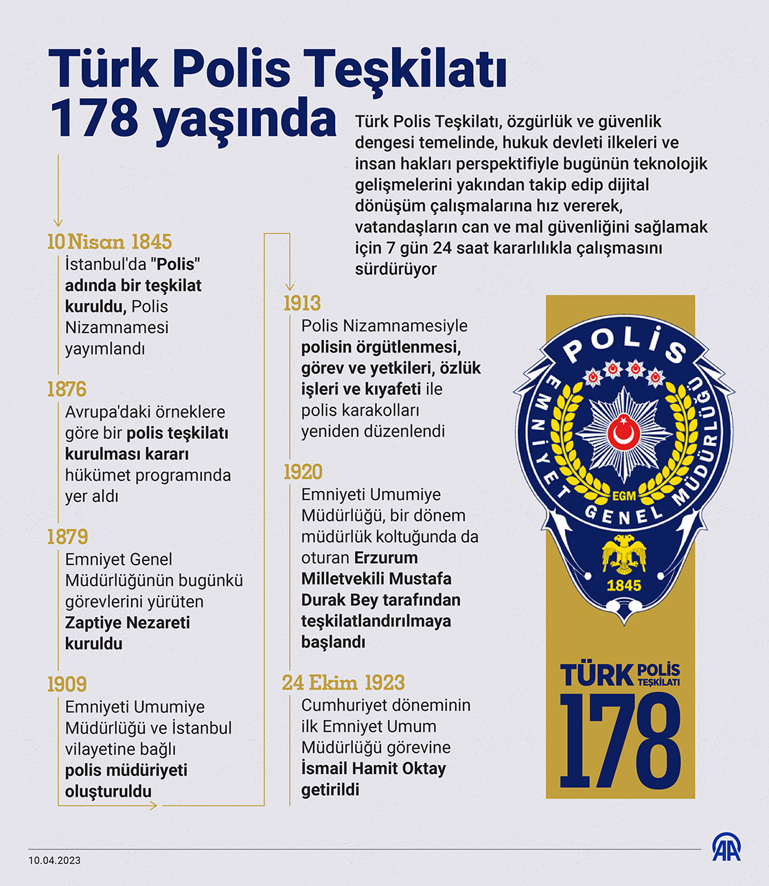 Türk Polis Teşkilatı, özgürlük ve güvenlik dengesi temelinde, hukuk devleti ilkeleri ve insan hakları perspektifiyle bugünün teknolojik gelişmelerini yakından takip edip dijital dönüşüm çalışmalarına hız vererek, vatandaşların can ve mal güvenliğini sağlamak için 7 gün 24 saat kararlılıkla çalışmasını sürdürüyor. (Grafik: Yasin Demirci/AA)10 Nisan 2023•Güncelleme: 10 Nisan 2023