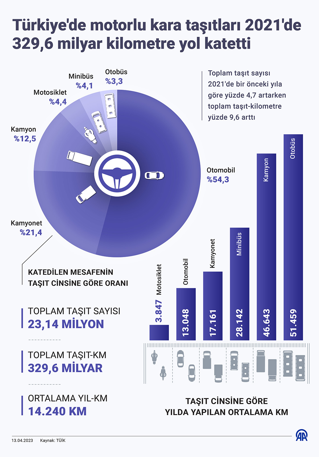 Türkiye'de motorlu kara taşıtları 2021'de 329,6 milyar kilometre yol katetti