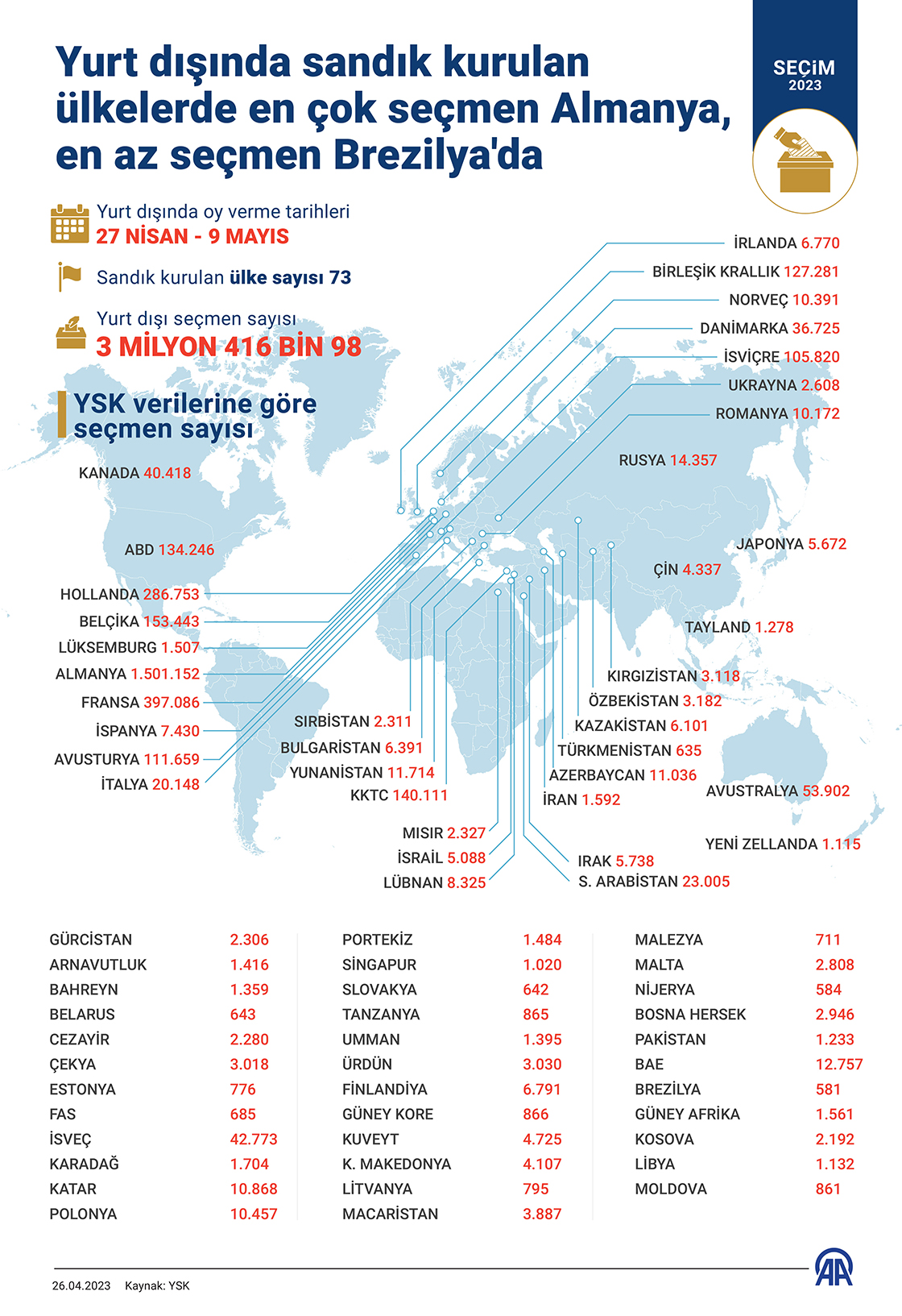 14 Mayıs seçimleri için Tanzanya'dan Singapur'a, Umman'dan Yeni Zelanda'ya kadar 73 ülkede sandık kurulacak, yurt dışı seçmen kütüğüne kayıtlı 3 milyon 416 bin 98 seçmen için oy kullanma işlemleri yarın başlıyor. (Grafik: Omar Zaghloul/AA)26 Nisan 2023•Güncelleme: 26 Nisan 2023