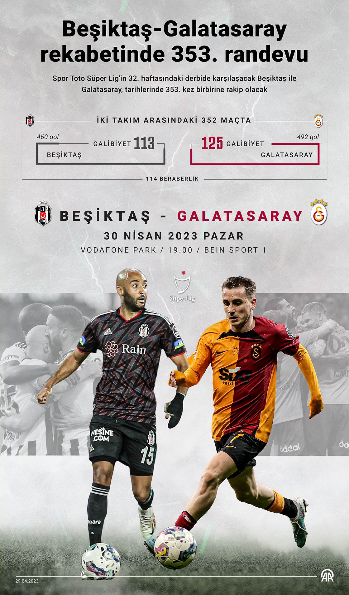Spor Toto Süper Lig'in 32. haftasındaki derbide yarın karşılaşacak Beşiktaş ile Galatasaray, tarihlerinde 353. kez birbirine rakip olacak. (Grafik: Muhammed Ali Yiğit/AA)