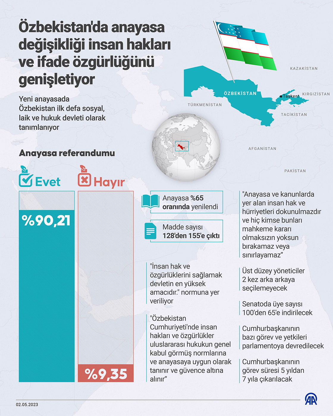 Özbekistan'da hafta sonu düzenlenen referandumla yüzde 90,21 ile kabul edilen anayasa değişikliği insan hakları ve ifade özgürlüğü sınırlarını genişletiyor. (Grafik: Yasin Demirci/AA)
