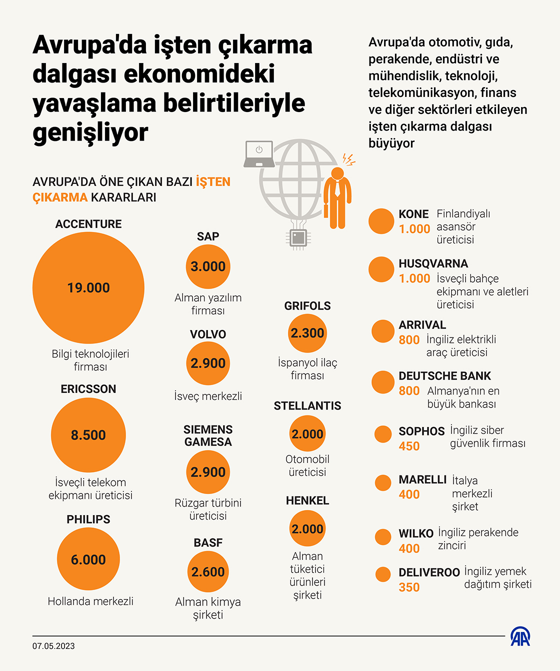 Avrupa'da, son 30 yılın en yüksek seviyesine çıkan enflasyon ve artan faizler özel tüketimi olumsuz etkileyerek ekonomiyi yavaşlatırken, kıtadaki pek çok şirket, çalışan sayısında azalmaya gittiğini ya da yeni alımlara ara verdiğini duyuruyor. (Grafik: Elmurod Usubaliev/AA)