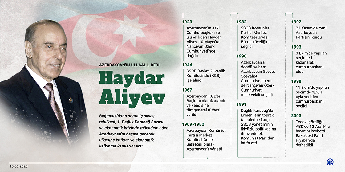 Hem Sovyetler hem de bağımsızlık döneminde ömrünü ülkesine ve halkına adayarak Azerbaycanlıların sevgisini kazanan Haydar Aliyev, saygı ve minnetle hatırlanıyor. (Grafik: Efnan İpşir/AA)