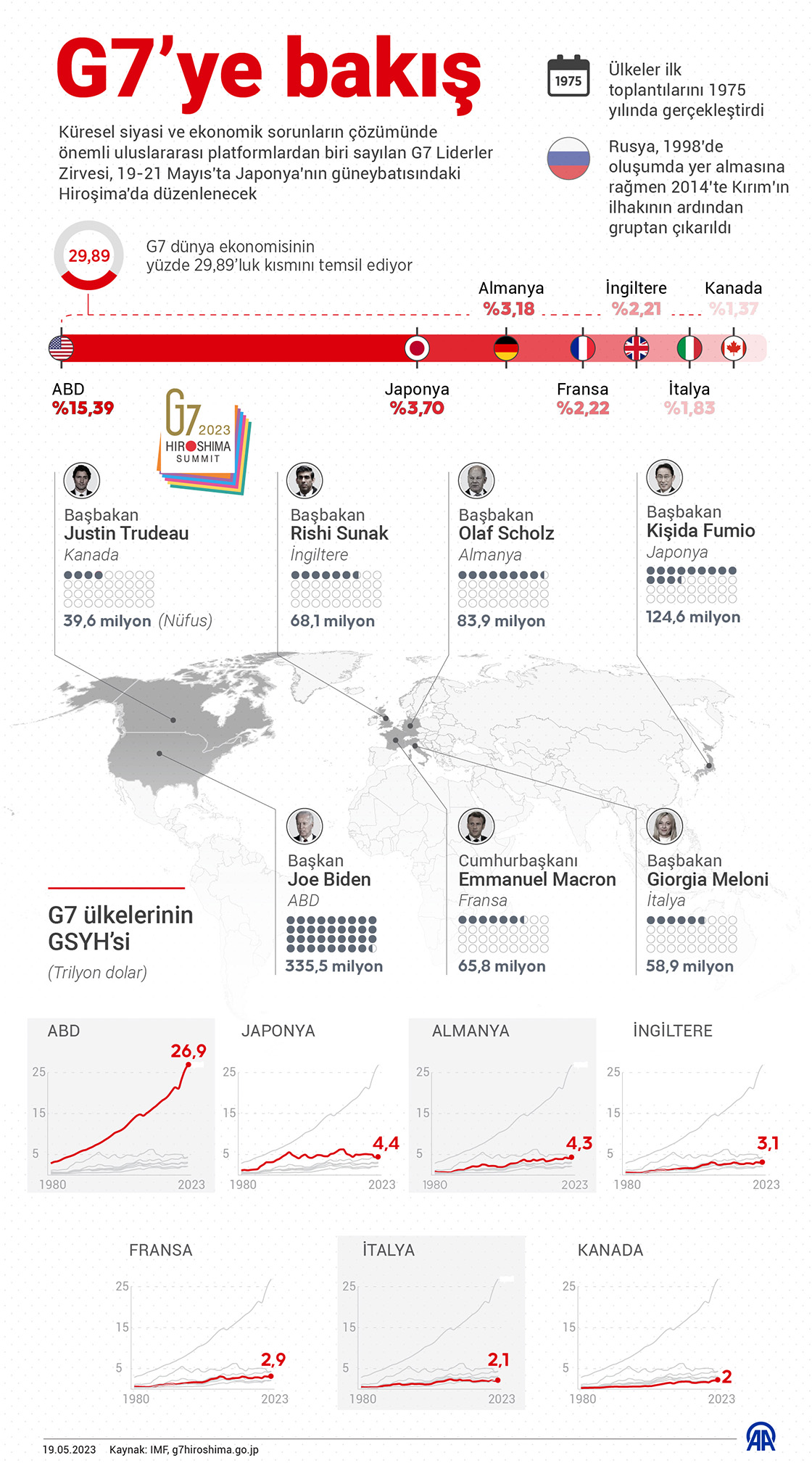 Japonya'nın Hiroşima kentinde 19-21 Mayıs tarihlerinde düzenlenecek G7 Liderler Zirvesi'nde Rusya-Ukrayna krizi, nükleer silahsızlanma, enerji ve ekonomi alanında güvenlik, Hint-Pasifik ve Tayvan Boğazı konularına odaklanılacak. (Grafik: Mahmut Resul Karaca/AA)