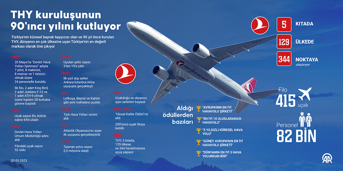 Türkiye'nin küresel bayrak taşıyıcısı olan ve 90 yıl önce kurulan THY, dünyanın en çok ülkesine uçan Türkiye'nin en değerli markası olarak öne çıkıyor. (Grafik: Muhammed Ali Yiğit/AA)