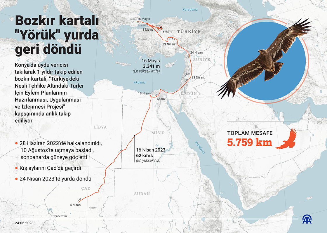 Konya'da uydu vericisi takılarak 1 yıldır takip edilen bozkır kartalı, "Türkiye'deki Nesli Tehlike Altındaki Türler İçin Eylem Planlarının Hazırlanması, Uygulanması ve İzlenmesi Projesi" kapsamında anlık takip ediliyor. (Grafik: Elmurod Usubaliev/AA)