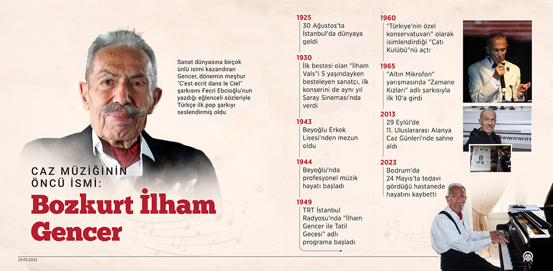 Sanat dünyasına bir çok ünlü isimi kazandıran Gencer, dönemin meşhur "C'est ecrit dans le Ciel" şarkısını Fecri Ebcioğlu'nun yazdığı eğlenceli sözleriyle Türkçe ilk pop şarkıyı seslendirmiş oldu. (Grafik: Omar Zaghloul/AA)