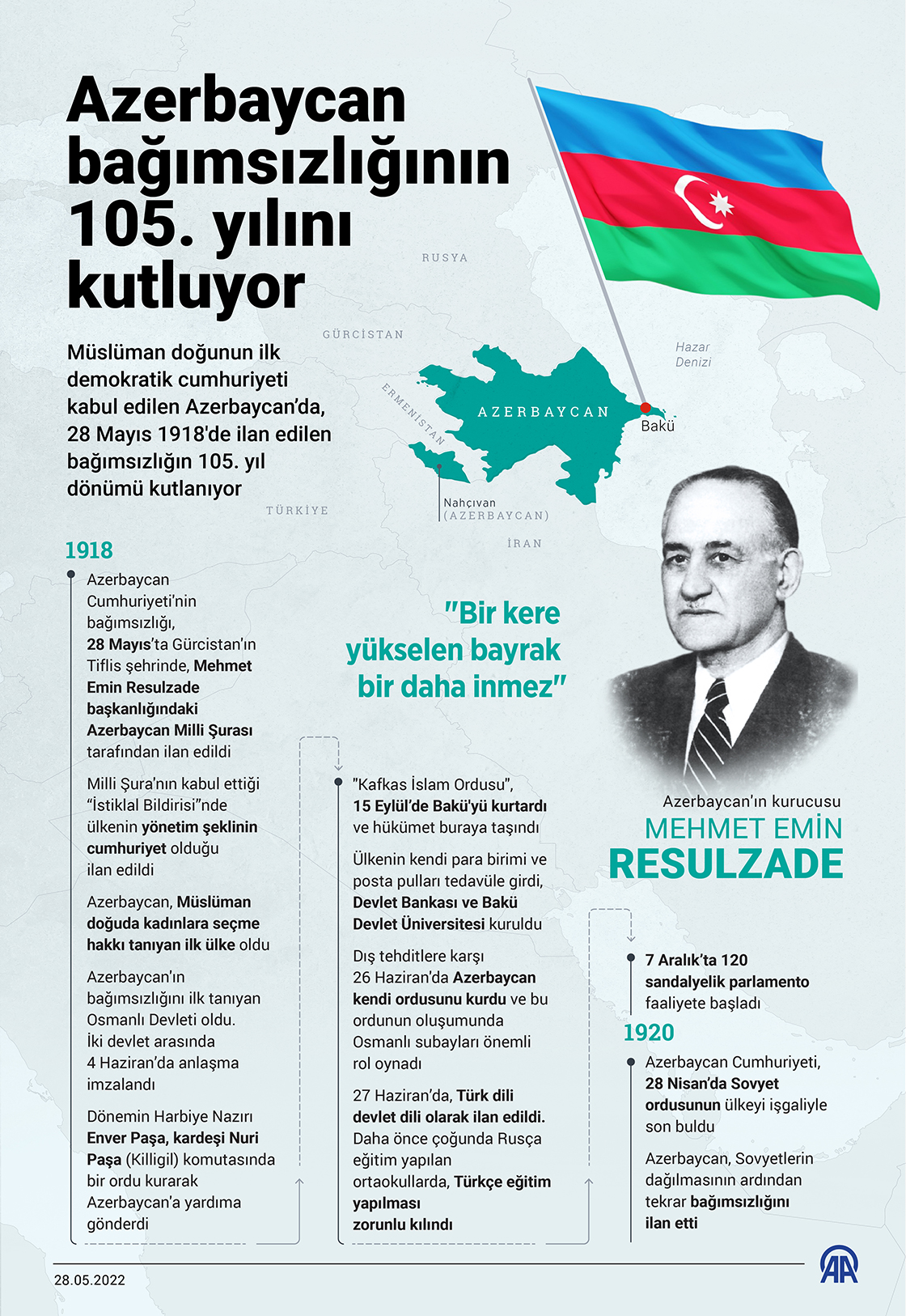 Müslüman doğunun ilk demokratik cumhuriyeti kabul edilen Azerbaycan’da, 28 Mayıs 1918'de ilan edilen bağımsızlığın 105. yıl dönümü kutlanıyor. (Grafik: Elmurod Usubaliev/AA)