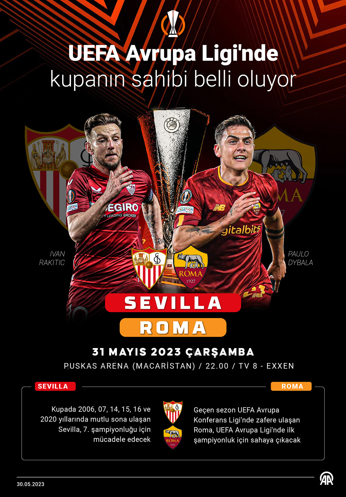 İspanya kulübü Sevilla ile İtalya'nın Roma takımları turnuvanın 52. şampiyonu olmak için mücadele edecek. (Grafik: Kemal Delikmen/AA)