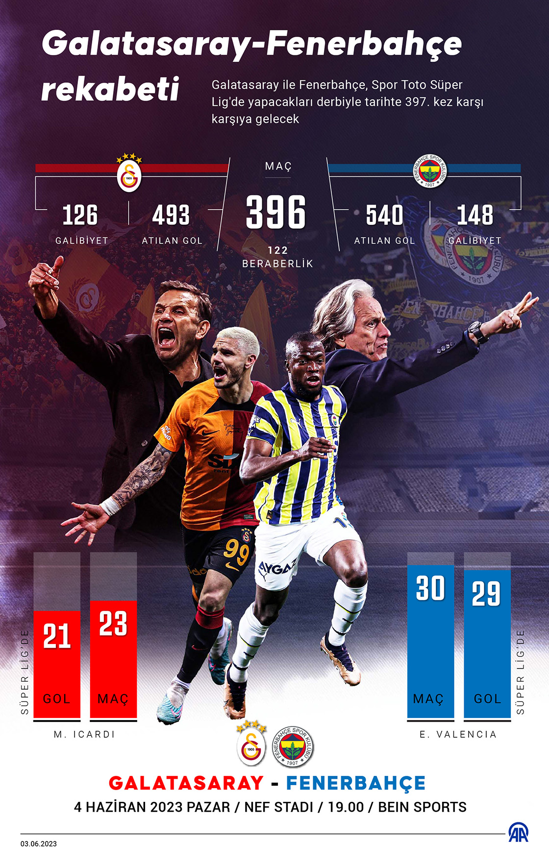 Galatasaray ile Fenerbahçe futbol takımları, Spor Toto Süper Lig'de yarın yapacakları derbiyle tarihte 397. kez karşı karşıya gelecek. (Grafik: Kemal Delikmen/AA)