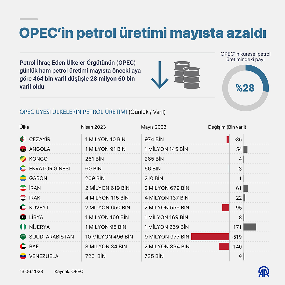Petrol İhraç Eden Ülkeler Örgütünün (OPEC) günlük ham petrol üretimi mayısta önceki aya göre 464 bin varil düşüşle 28 milyon 60 bin varil oldu. (Grafik: Elmurod Usubaliev/AA)