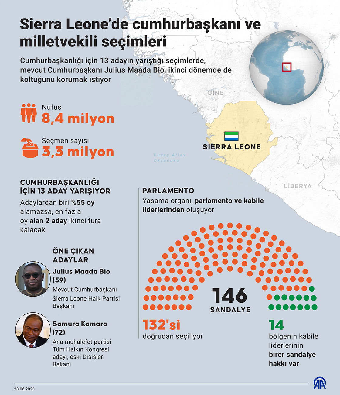 Cumhurbaşkanlığı için 13 adayın yarıştığı seçimlerde, mevcut Cumhurbaşkanı Julius Maada Bio, ikinci dönemde de koltuğunu korumak istiyor. (Grafik: Yasin Demirci/AA)