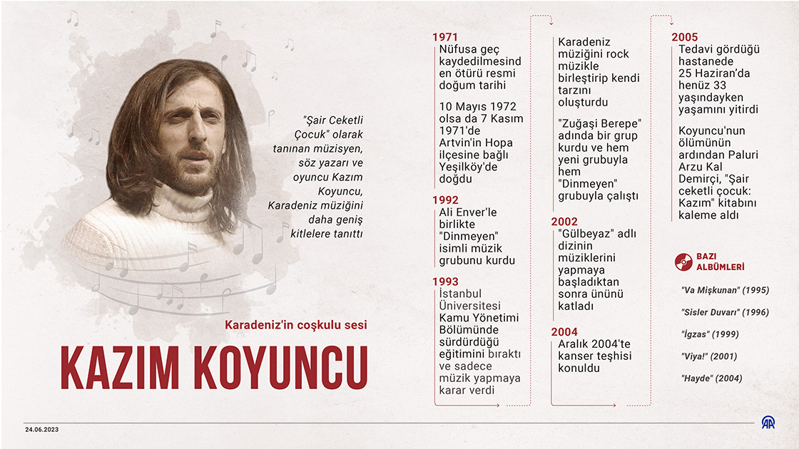 "Şair Ceketli Çocuk" olarak tanınan müzisyen, söz yazarı ve oyuncu Kazım Koyuncu, Karadeniz müziğini daha geniş kitlelere tanıttı. (Grafik: Efnan İpşir/AA)