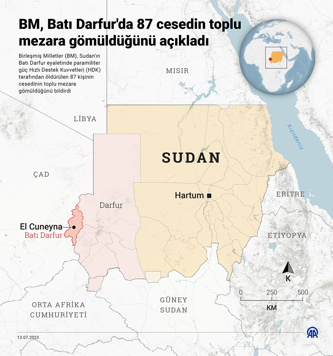 Birleşmiş Milletler (BM), Sudan'ın Batı Darfur eyaletinde paramiliter güç Hızlı Destek Kuvvetleri (HDK) tarafından öldürülen 87 kişinin cesedinin toplu mezara gömüldüğünü bildirdi. (Grafik: Elmurod Usubaliev/AA)