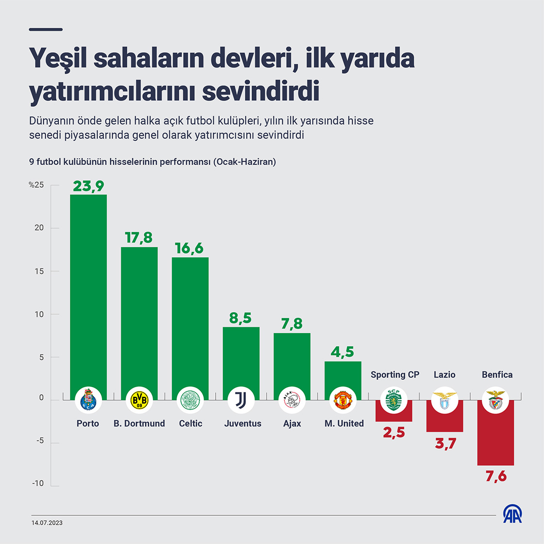 Dünyanın önde gelen halka açık futbol kulüpleri, yılın ilk yarısında hisse senedi piyasalarında genel olarak yatırımcısını sevindirdi. (Grafik: Mahmut Resul Karaca/AA)