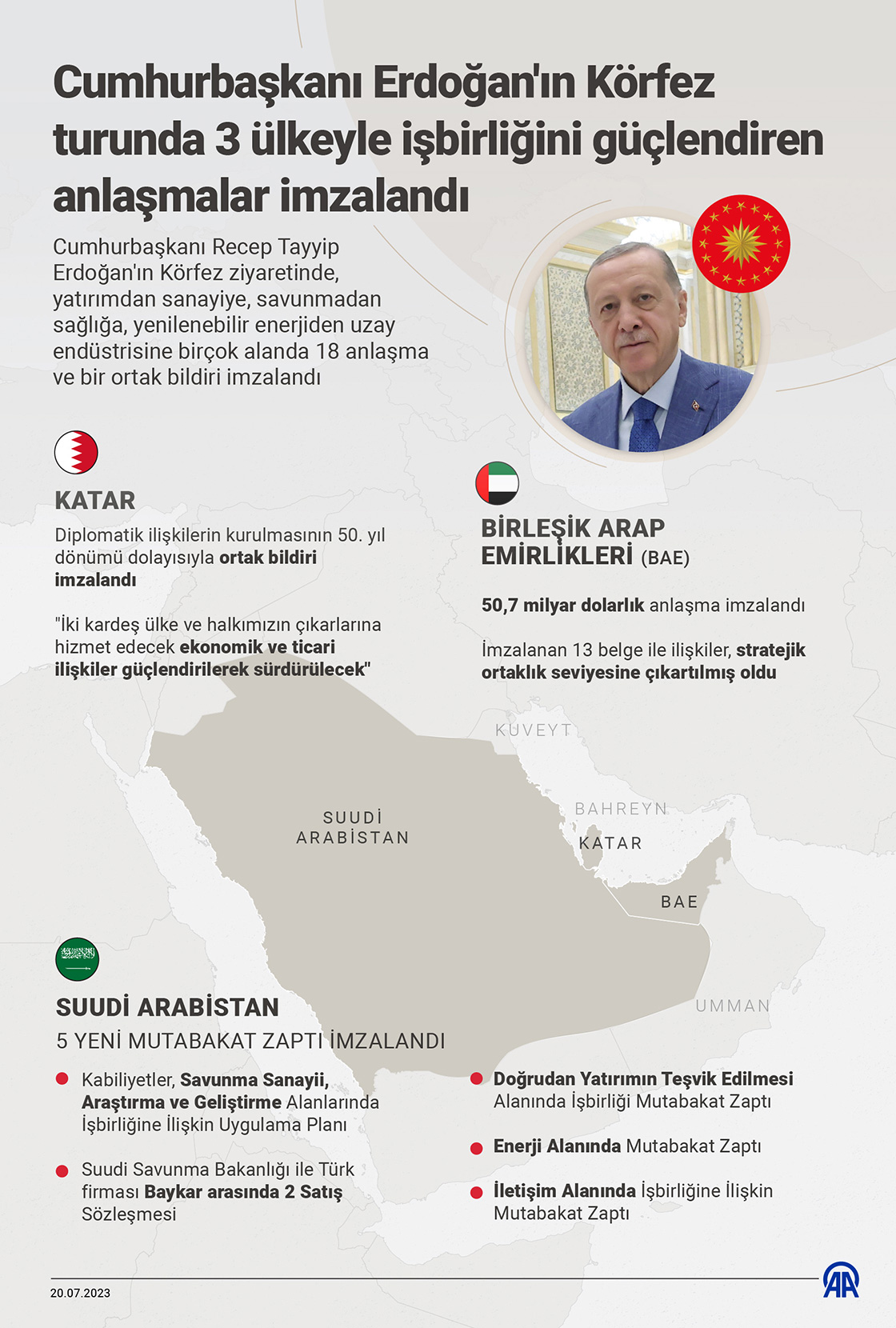 Cumhurbaşkanı Recep Tayyip Erdoğan'ın Körfez ziyaretinde, yatırımdan sanayiye, savunmadan sağlığa, yenilenebilir enerjiden uzay endüstrisine birçok alanda 18 anlaşma ve bir ortak bildiri imzalandı.20 Temmuz 2023•Güncelleme: 20 Temmuz 2023