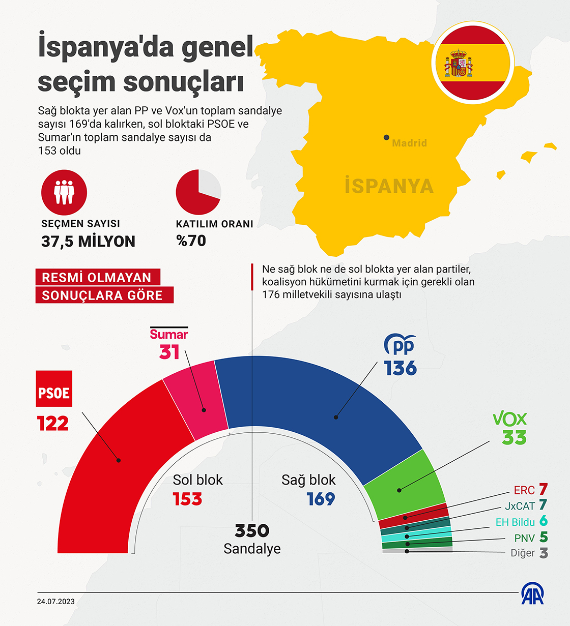 İspanya'da yapılan erken genel seçimlerde, resmi rakamlara göre yüzde 96 açılan sandık oranı ile mevcut durumda iktidardaki sol da muhalefetteki sağ siyasi partiler de meclis çoğunluğunu elde edip hükümeti kuracak sonuç çıkaramadı. (Grafik: Mahmut Resul Karaca/AA)24 Temmuz 2023•Güncelleme: 24 Temmuz 2023