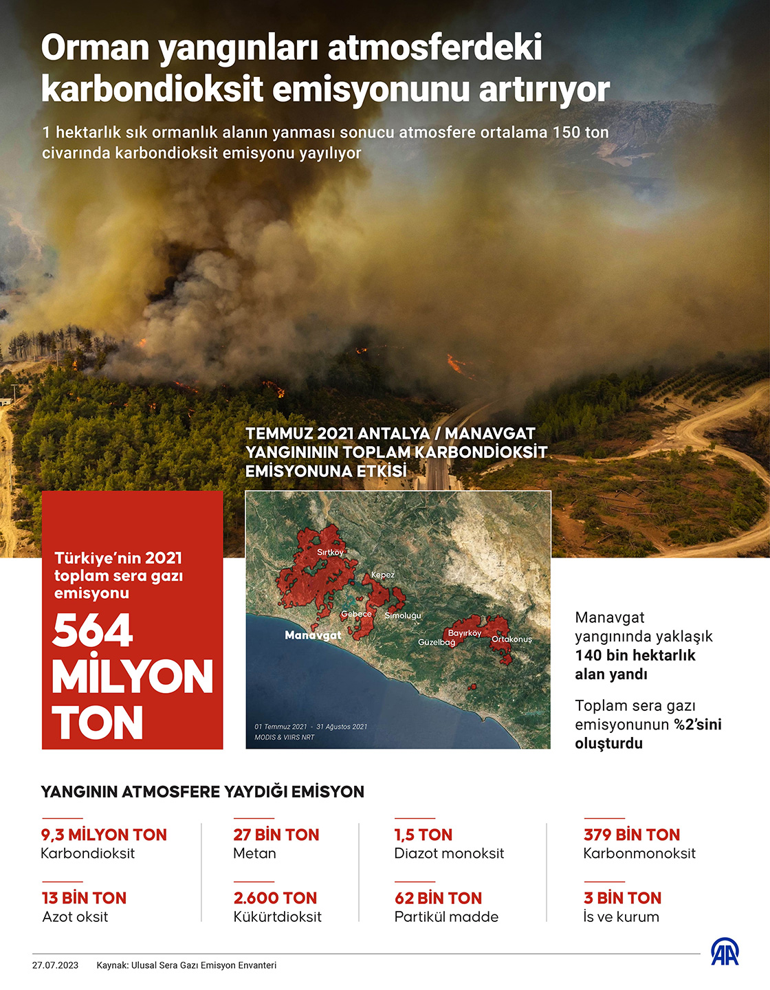 İstanbul Üniversitesi Cerrahpaşa Orman Fakültesi Toprak İlmi ve Ekoloji Ana Bilim Dalı Başkanı Prof. Dr. Doğanay Tolunay, 2021'de Manavgat'ta başlayıp büyük bir alana yayılan orman yangınlarında ortaya çıkan karbondioksit emisyonunun Türkiye'nin o yılki toplam sera gazı emisyonunun yüzde 2'sine denk geldiğine işaret etti.(Grafik: Yasin Demirci/AA)27 Temmuz 2023•Güncelleme: 27 Temmuz 2023