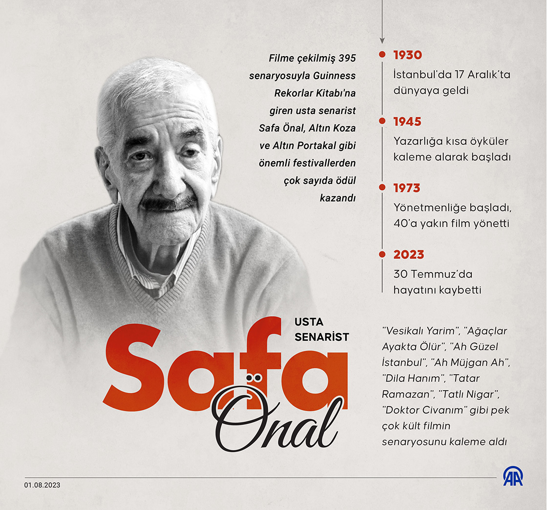 Filme çekilmiş 395 senaryosuyla Guinness Rekorlar Kitabı'na giren usta senarist Safa Önal, Altın Koza ve Altın Portakal gibi önemli festivallerden çok sayıda ödül kazandı.(Grafik: Muhammed Ali Yiğit/AA)