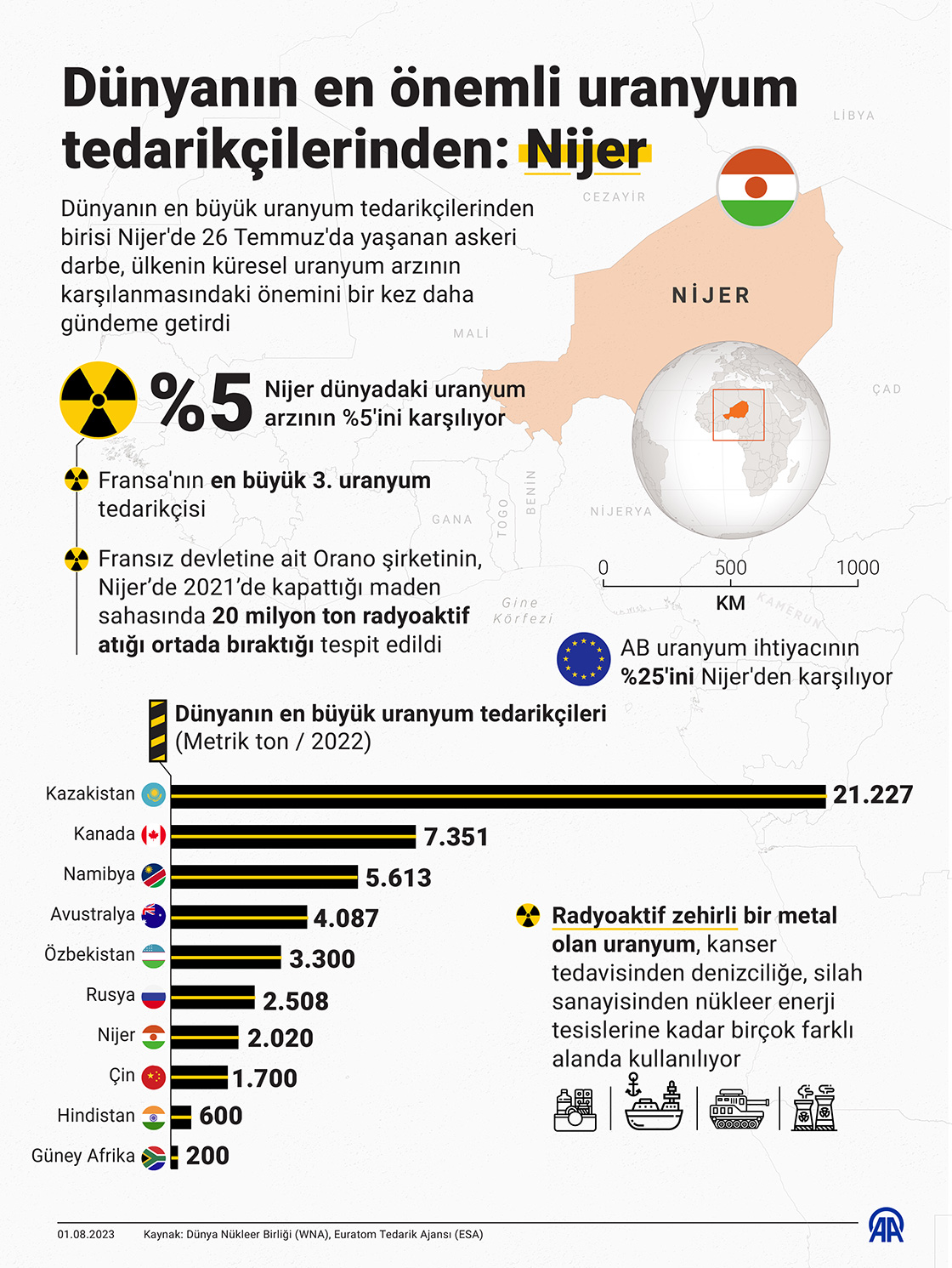 Dünyanın en büyük uranyum tedarikçilerinden birisi Nijer'de 26 Temmuz'da yaşanan askeri darbe, ülkenin küresel uranyum arzının karşılanmasındaki önemini bir kez daha gündeme getirdi.(Grafik: Omar Zaghloul/AA)