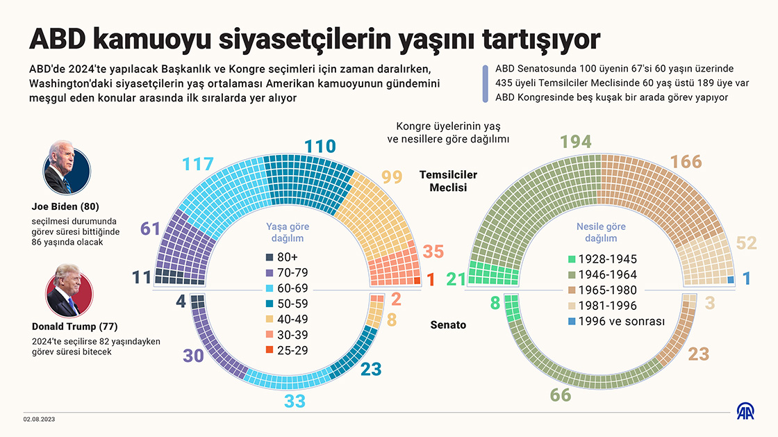 ABD'de 2024'te yapılacak Başkanlık ve Kongre seçimleri için zaman daralırken, başkent Washington'daki siyasetçilerin yaş ortalaması Amerikan kamuoyunun gündemini meşgul eden konular arasında ilk sıralarda yer alıyor.(Grafik: Omar Zaghloul/AA)02 Ağustos 2023•Güncelleme: 02 Ağustos 2023