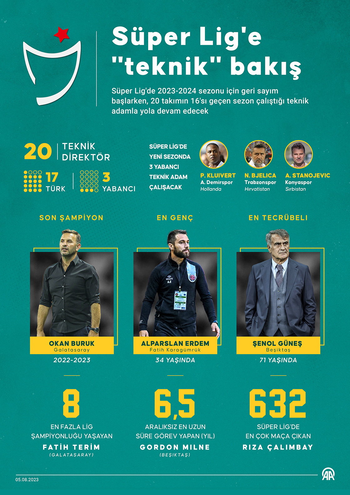 Süper Lig'de 2023-2024 sezonu için geri sayım başlarken, 20 takımın 16'sı geçen sezon çalıştığı teknik adamla yola devam edecek.(Grafik: Muhammed Ali Yiğit/AA)