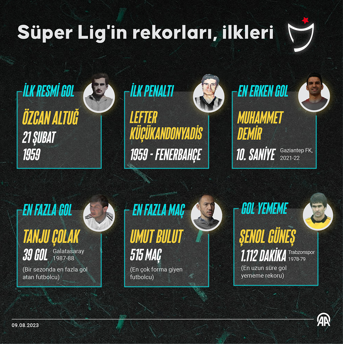 66 yaşına girmeye hazırlanan eski adıyla Türkiye 1. Futbol Ligi, son yıllardaki ismiyle Süper Lig tarihinde ilk resmi golü İzmirsporlu Özcan Altuğ attı.(Grafik: Mahmut Resul Karaca/AA)