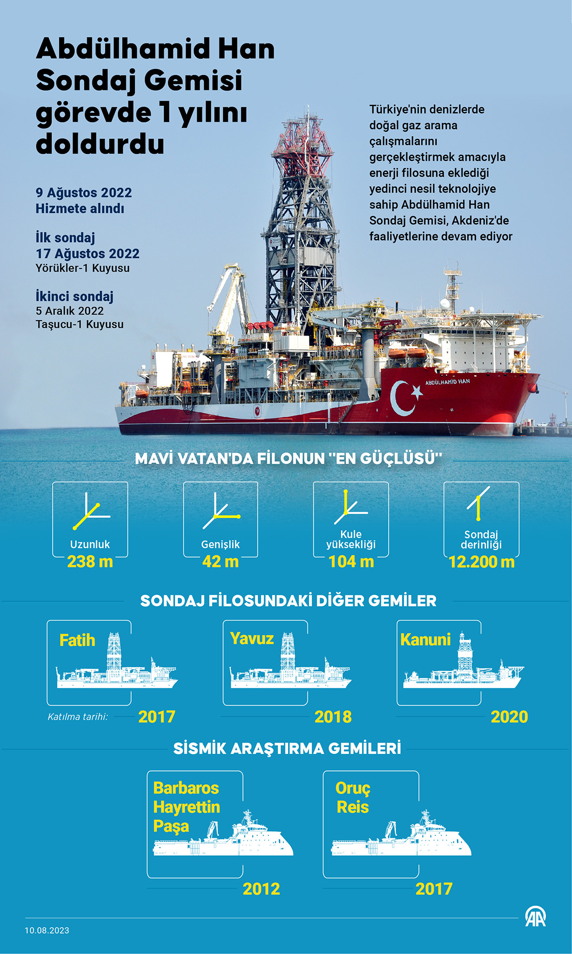 Türkiye'nin denizlerde doğal gaz arama çalışmalarını gerçekleştirmek amacıyla son yıllarda enerji filosuna eklediği yedinci nesil teknolojiye sahip Abdülhamid Han Sondaj Gemisi, Akdeniz'deki sondaj faaliyetlerinde 1 yılı geride bıraktı. (Grafik: Efnan İpşir/AA)10 Ağustos 2023•Güncelleme: 10 Ağustos 2023
