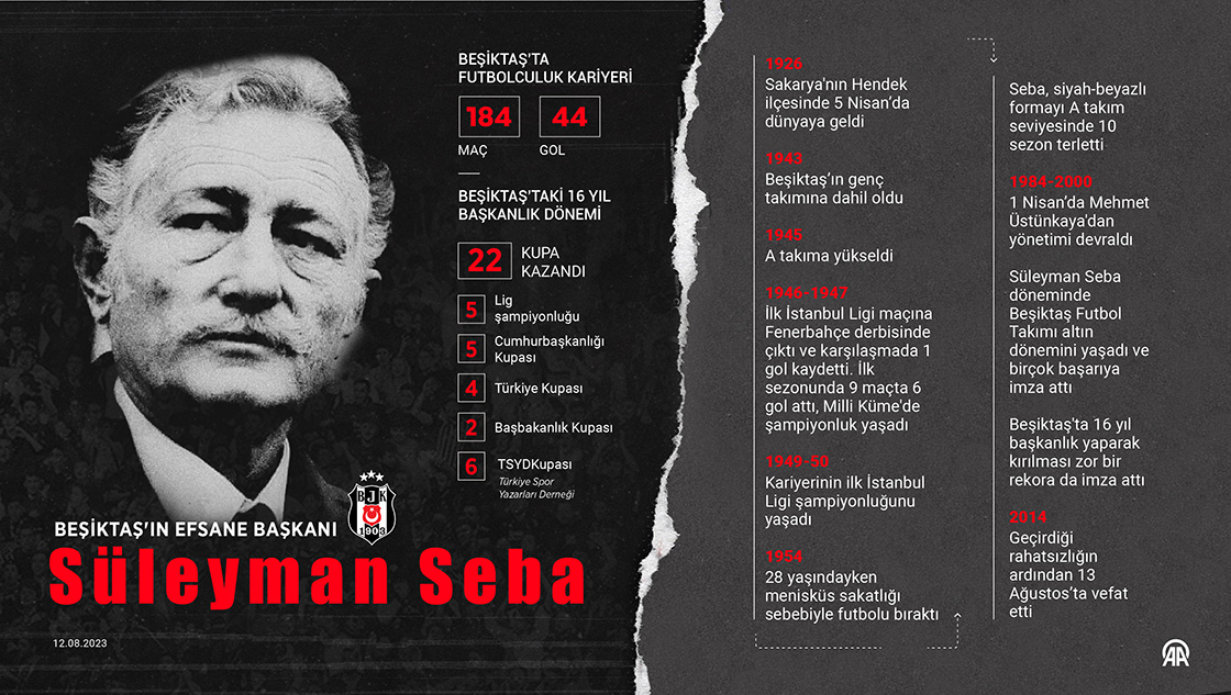 Beşiktaş'a futbolcu, yönetici ve başkan olarak hizmet veren ve kazandırdığı başarılarla camianın efsane isimleri arasına giren Süleyman Seba, vefatının 9. yıl dönümünde anılıyor.(Grafik: Kemal Delikmen/AA)