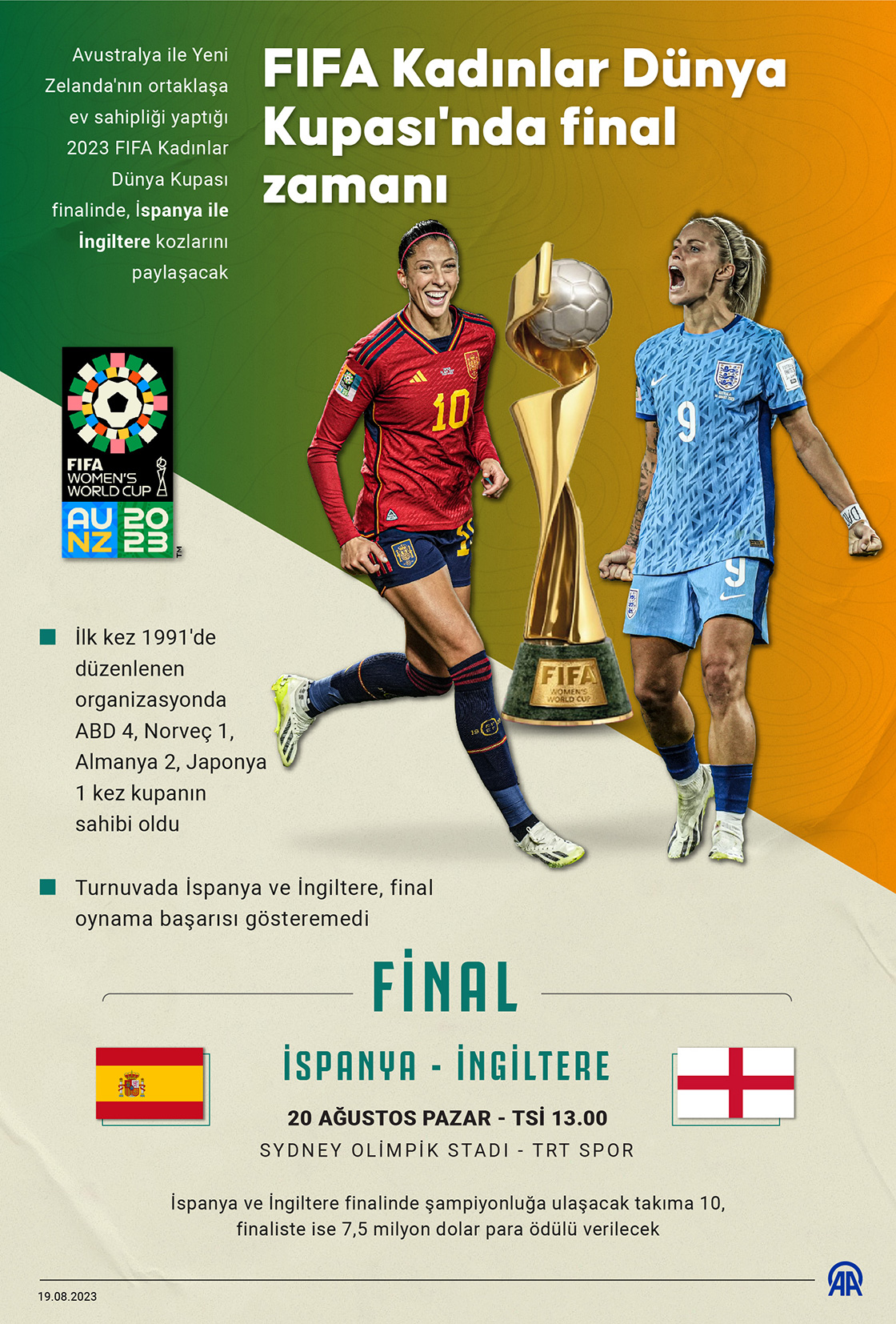 Avustralya ile Yeni Zelanda'nın ortaklaşa ev sahipliği yaptığı 2023 FIFA Kadınlar Dünya Kupası finalinde, İspanya ile İngiltere kozlarını paylaşacak.(Grafik: Kemal Delikmen/AA)