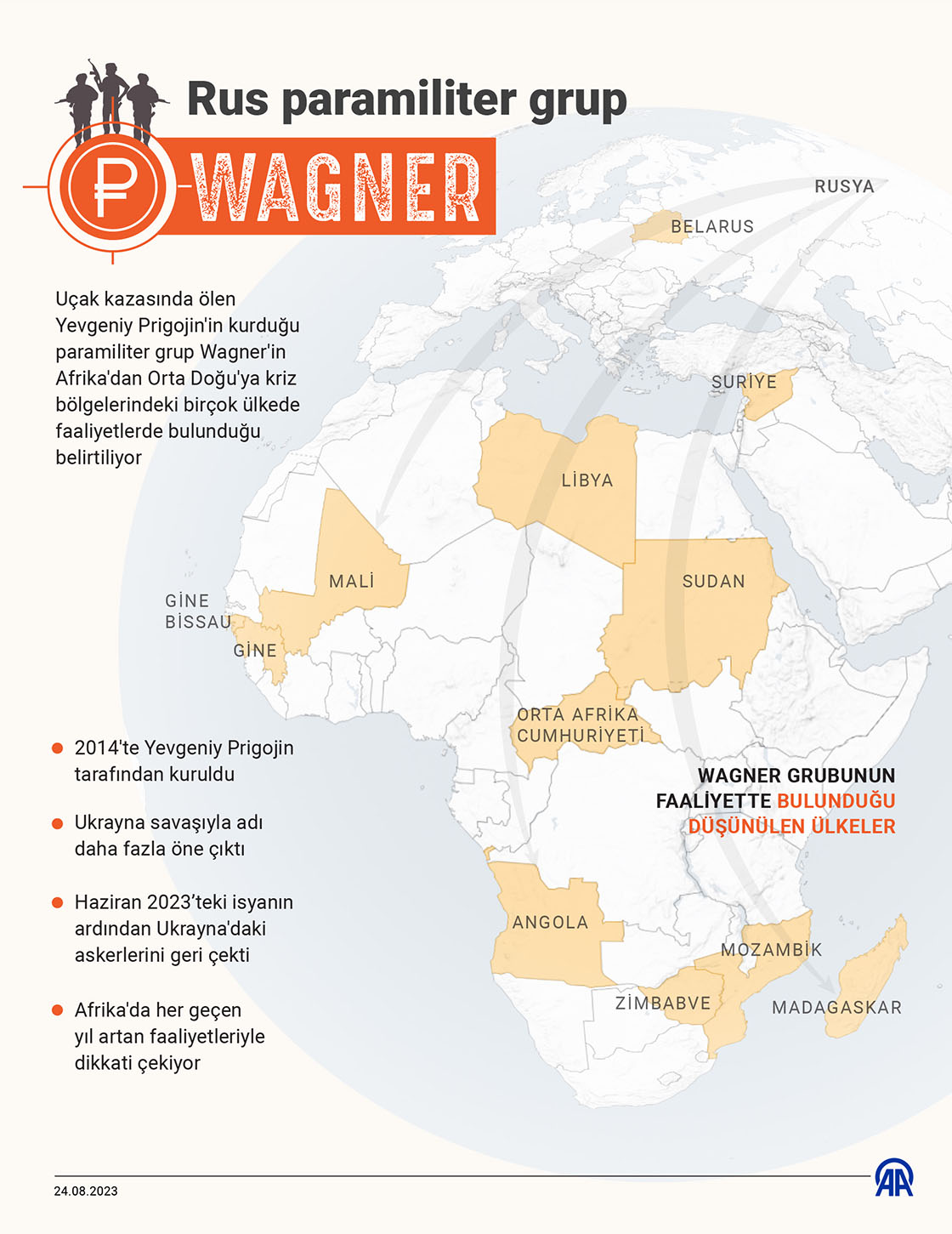 Rusya Devlet Başkanı Vladimir Putin'in 'şefi' olarak bilinen ve dün Moskova yakınlarındaki uçak kazasında ölen Yevgeniy Prigojin'in kurduğu paramiliter grup Wagner'in Afrika'dan Orta Doğu'ya kriz bölgelerindeki birçok ülkede faaliyetlerde bulunduğu belirtiliyor.