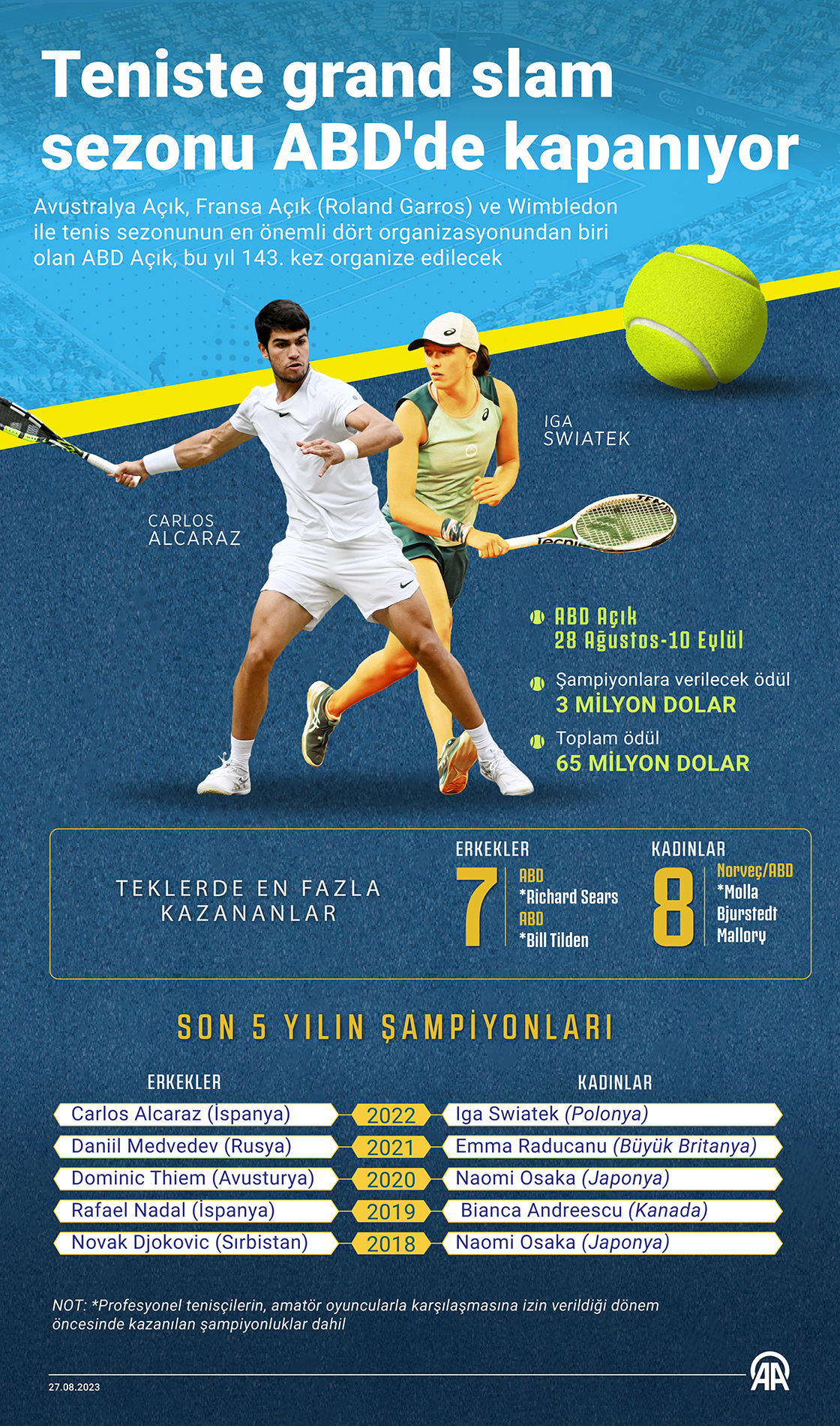 Avustralya Açık, Fransa Açık (Roland Garros) ve Wimbledon ile tenis sezonunun en önemli dört organizasyonundan biri olan ABD Açık, bu yıl 28 Ağustos-10 Eylül tarihlerinde 143. kez organize edilecek.(Grafik: Omar Zaghloul/AA)