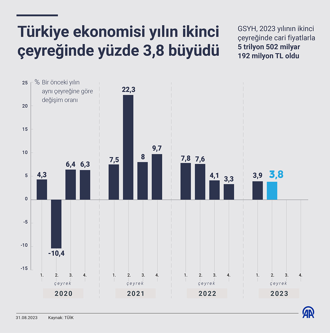 GSYH, 2023 yılının ikinci çeyreğinde cari fiyatlarla 5 trilyon 502 milyar 192 milyon TL oldu.(Grafik: Muhammed Ali Yiğit/AA)