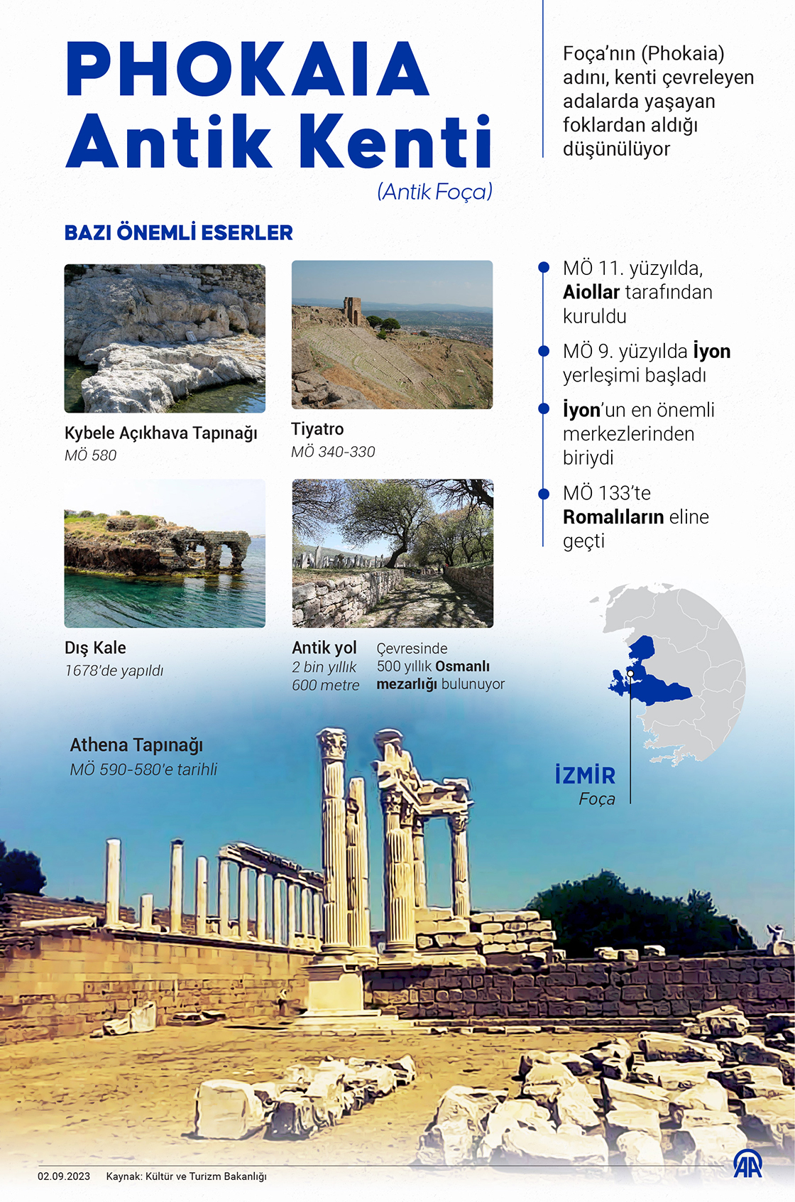 Foça’nın (Phokaia) adını, kenti çevreleyen adalarda yaşayan foklardan aldığı düşünülüyor. (Grafik: Mahmut Resul Karaca/AA)