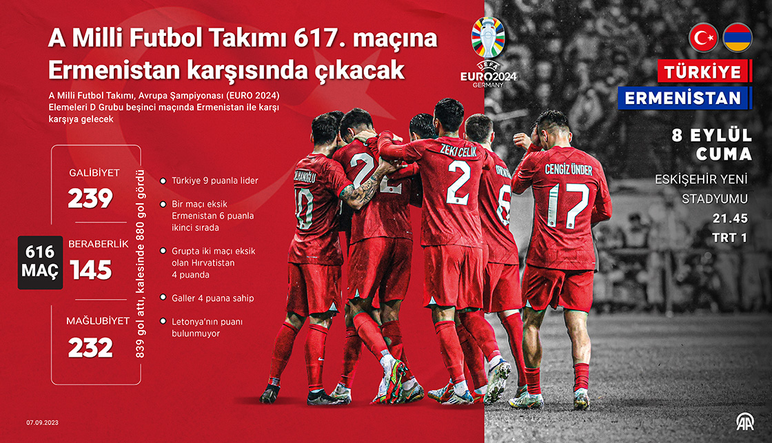 UEFA 2024 Avrupa Şampiyonası (EURO 2024) Elemeleri D Grubu beşinci maçında yarın Eskişehir'de Ermenistan ile karşı karşıya gelecek A Milli Futbol Takımı, tarihindeki 617. müsabakaya çıkacak.(Grafik: Efnan İpşir/AA)