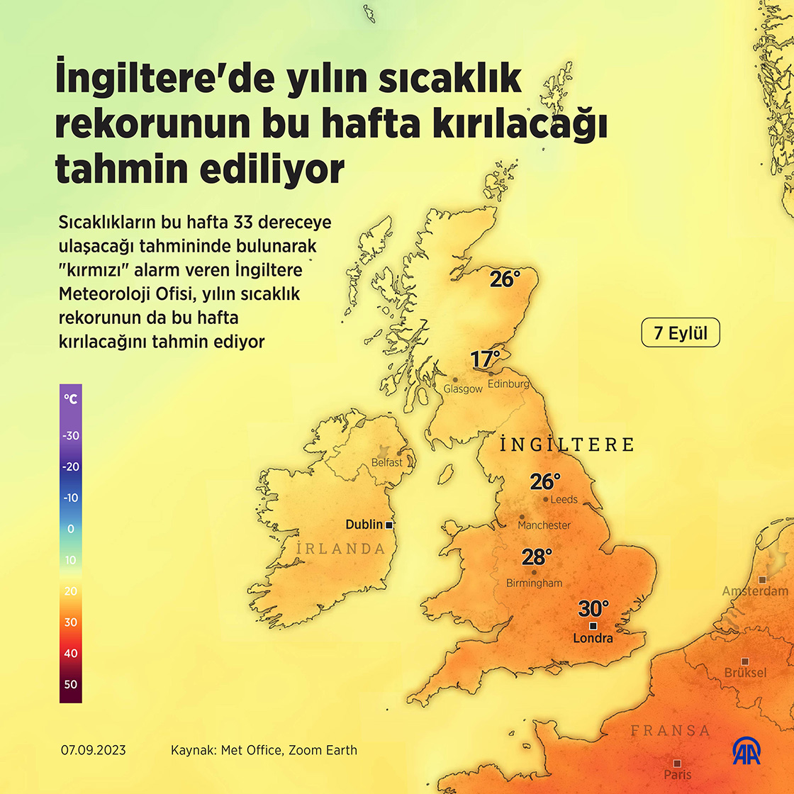 Sıcaklıkların bu hafta 33 dereceye ulaşacağı tahmininde bulunarak 'kırmızı' alarm veren İngiltere Meteoroloji Ofisi (Met Office), yılın sıcaklık rekorunun da bu hafta kırılacağını tahmin ediyor.(Grafik: Elmurod Usubaliev/AA)07 Eylül 2023•Güncelleme: 07 Eylül 2023