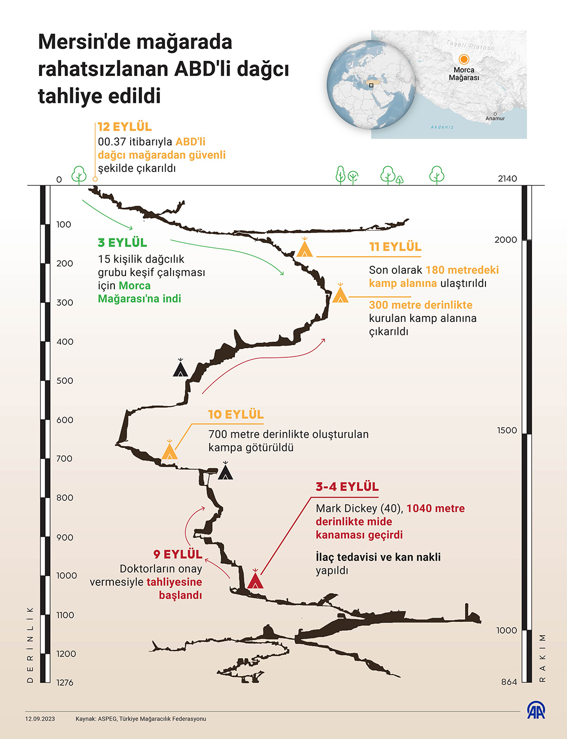 Mersin'in Anamur ilçesinde, 3 Eylül'de indiği mağarada rahatsızlanan ve ilaç tedavisi uygulanan ABD'li dağcının tahliyesi tamamlandı.(Grafik: Yasin Demirci/AA)