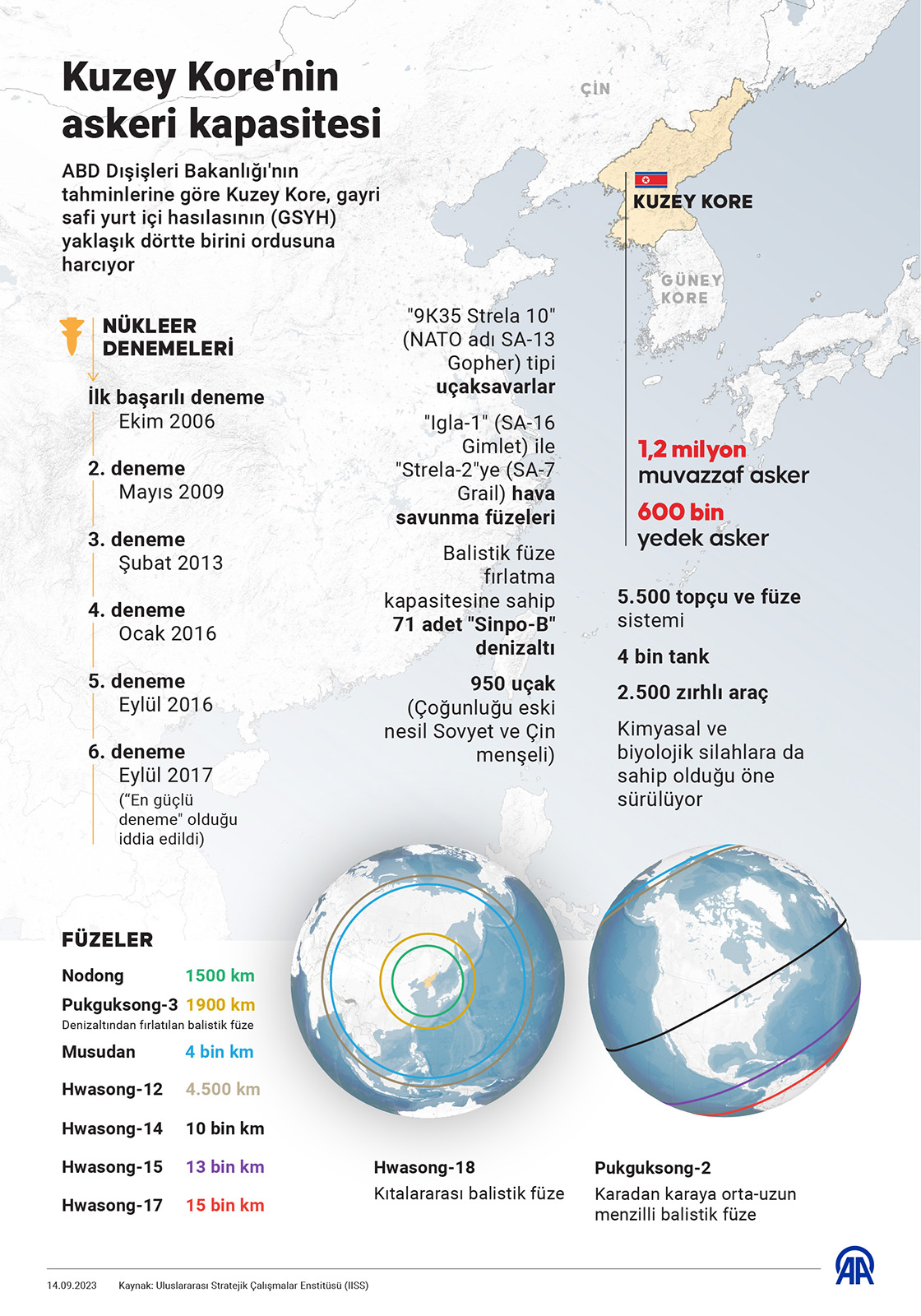 Kuzey Kore'nin son yıllarda askeri geçitlerle meydan okumaları ve füze denemeleriyle sıkça gündeme gelen silah kapasitesi, ülkenin lideri Kim Jong-un'un Rusya ziyaretinin "gıda ve teknoloji ithalatı" karşılığında "silah ticareti" yorumlarının ardından tekrar tartışılmaya başladı. (Grafik: Yasin Demirci/AA)14 Eylül 2023•Güncelleme: 14 Eylül 2023