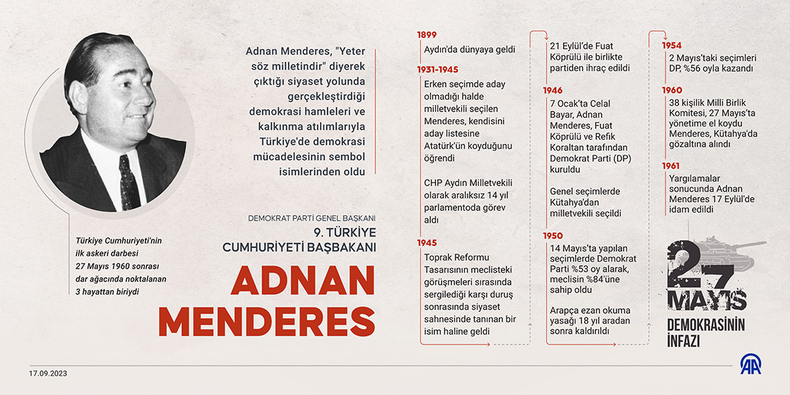 Adnan Menderes, 'Yeter söz milletindir' diyerek çıktığı siyaset yolunda gerçekleştirdiği demokrasi hamleleri ve kalkınma atılımlarıyla Türkiye'de demokrasi mücadelesinin sembol isimlerinden oldu.(Grafik: Muhammed Ali Yiğit/AA)